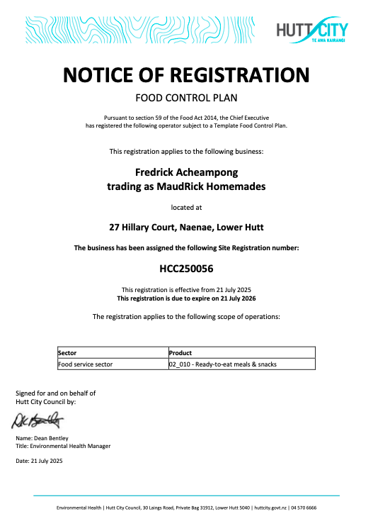 To ensure your peace of mind, Maudrick Homemade Foods operates under strict food safety protocols and is registered with the Hutt City Council. Our commitment is to provide delicious, homemade food that is always safe, hygienic, and full of authentic flavour.